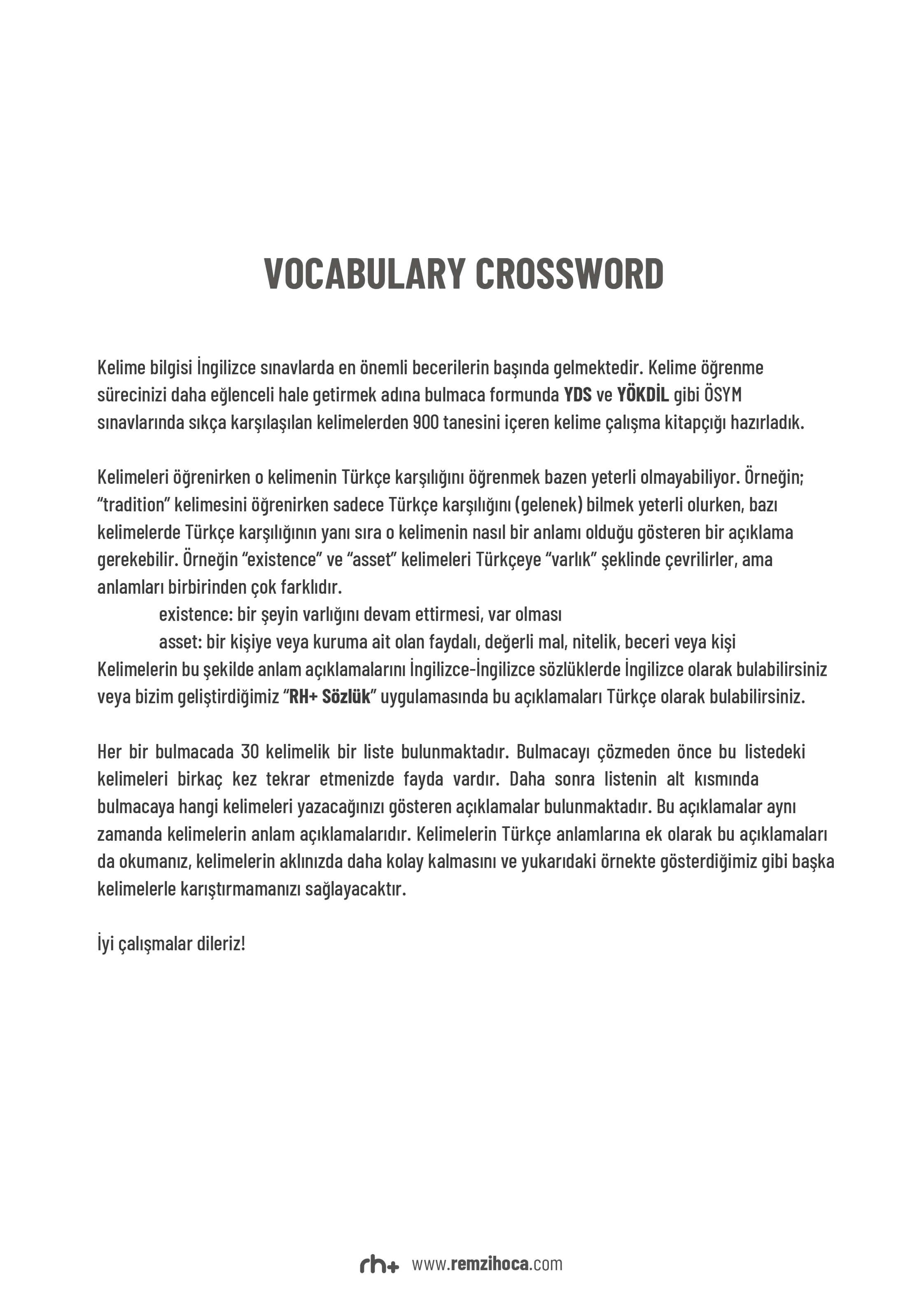 Kelime öğrenme sürecinizi daha eğlenceli hale getirmek adına bulmaca formunda YDS ve YÖKDİL gibi ÖSYM sınavlarında sıkça karşılaşılan kelimelerden 900 tanesini içeren ve 30 adet bulmacadan oluşan kelime çalışma kitapçığı hazırladık.